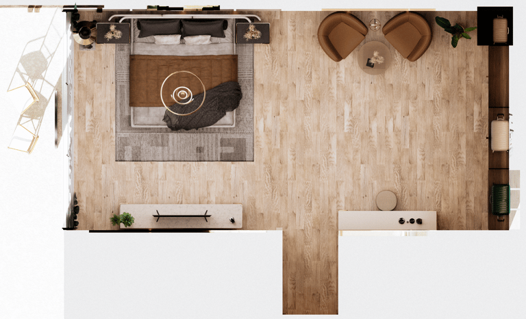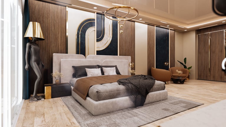 This 3D interior visualization showcases a luxurious hotel bedroom with carefully designed furniture, materials, and lighting to create a high-end, inviting atmosphere. The project focuses on realism, composition, and attention to detail, delivering a visually stunning space.